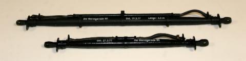 Fertigmodelle von Kuppelstangen für Rollböcke und Rollwagen - Länge, Luftleitung und Bremssystem gemäß Kundenwunsch - vorbildgerecht beschriftet.
